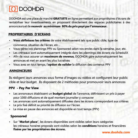 DOOHDA est une place de marché GRATUITE en ligne permettant aux propriétaires d'écrans de