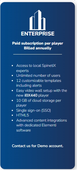 L'offre Enterprise combine la flexibilité du cloud et la puissance inégalée d'Elementi, le logiciel leader du marché. Profitez de plus de 250 widgets connectés à vos données en temps réel. Créez des projets complexes sur Elementi et déployez-les en un clic via l'interface SpinetiX ARYA pour une diffusion globale et maîtrisée.