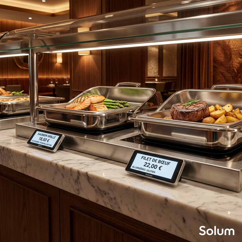 Fini les buffets figés et les menus manuscrits raturés : les étiquettes électroniques transforment votre service de restauration en une expérience interactive et fluide.